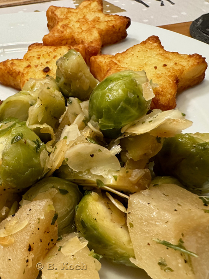 Diese Rosenkohlvariante mit süßlichem Touch hat uns sehr gut geschmeckt. Es war sogar noch ein Rest übrig, den ich zu einem leckeren Salat weiterverarbeitet habe.