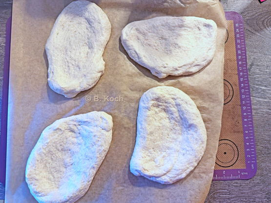 Den Teig noch einmal dehnen und falten, anschließend vier gleichgroße Teile abstechen, zu nicht zu dünnen Ovalen ausziehen und abgedeckt eine weitere Stunde ruhen lassen.