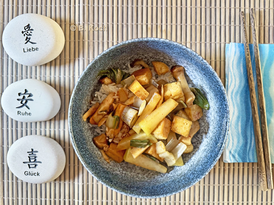 danke für die lieben Worte! – Und: Dein Gericht sieht traumhaft schön aus. Sogar mit chinesischen Schriftzeichen als Deko! Bei mir gab’s ja nur die Pfanne (als Wok-Ersatz) auf dem Foto.