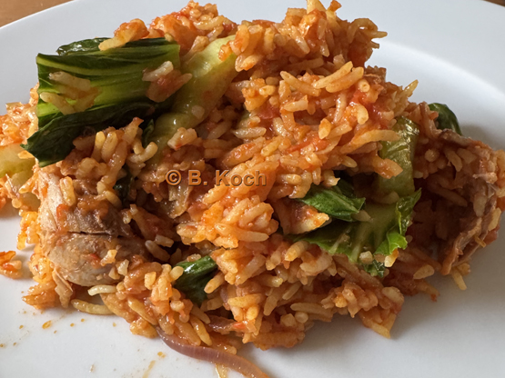 Und da noch eine Riesenportion Reis übrig war, gab es am Folgetag noch Jollofreis mit gedünstetem Pak Choi, was auch sehr lecker war: