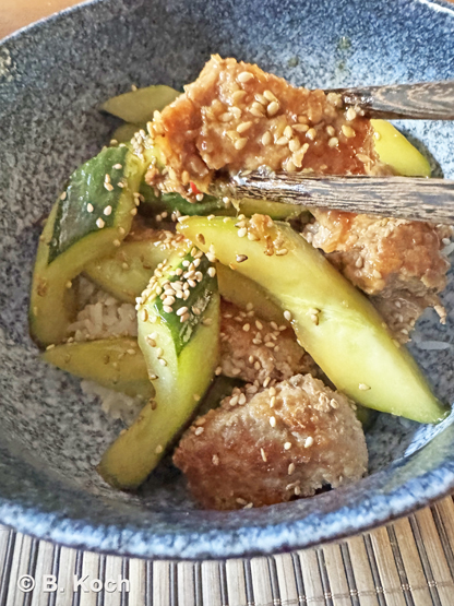Das war ein richtig feines, relativ schnell gemachtes Essen. Ich könnte mir vorstellen, dass man statt Gurke auch gut Zucchini, Brokkoli oder grünen Spargel nehmen kann und auch das Hackfleisch ließe sich gut durch z. B. Rindfleisch oder Geflügel ersetzen, denn der hervorragende Geschmack kommt von der tollen Sauce und den übrigen Gewürzen.