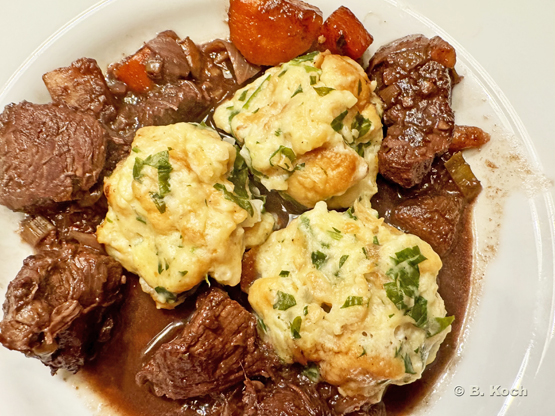 Als Beilage gab es Semmelknödelchen, die vorbereitet im Tiefkühlschlaf gewartet hatten und nun 20 Minuten im Dampfgarer zum Leben erwachen durften.