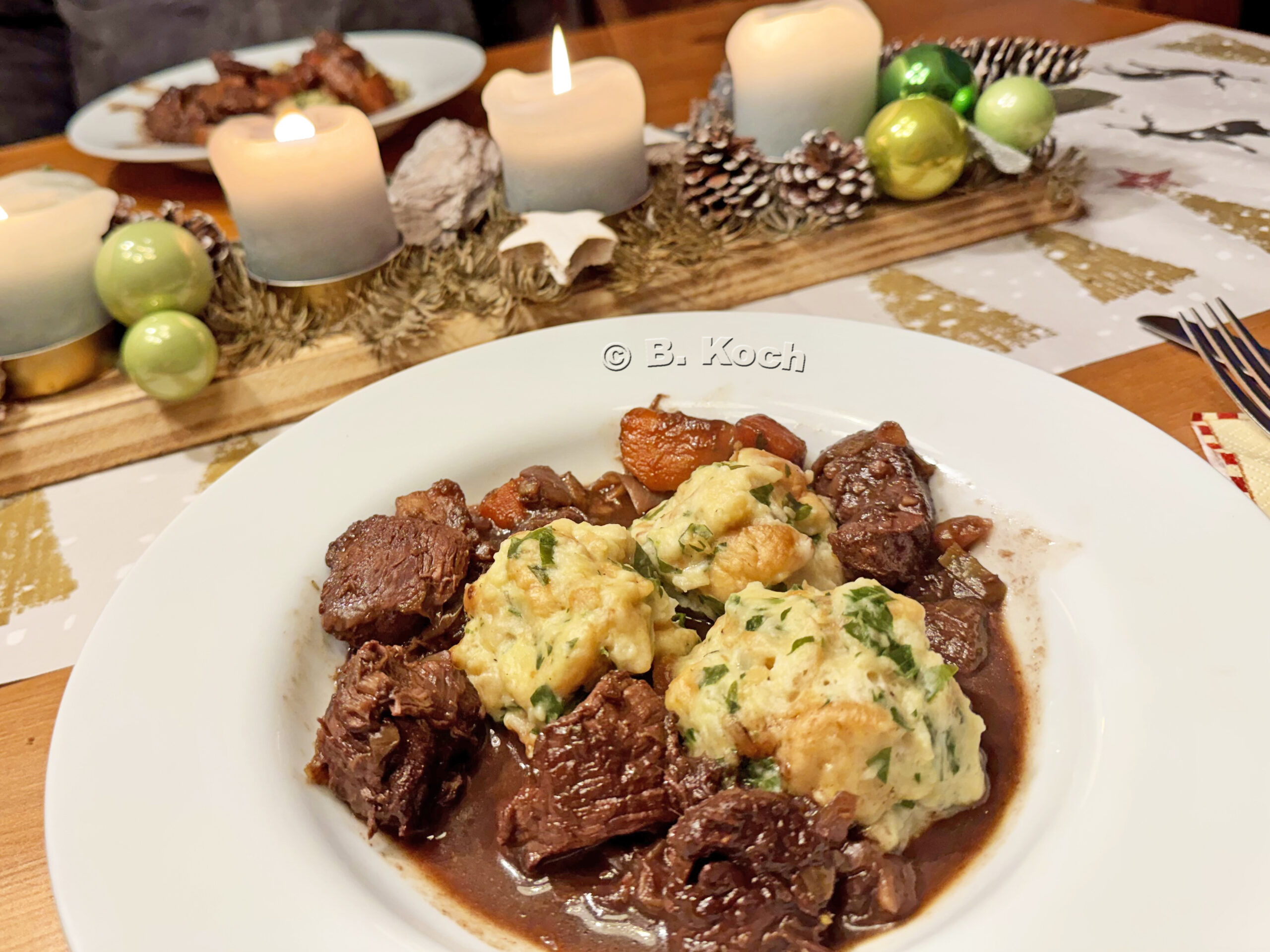 Am zweiten Feiertag gab es ein geniales Hirschgulasch, das ich nach diesem Rezept zubereitet hatte und dann stundenlang im Slowcooker schmurgeln durfte, zunächst 2 Stunden auf HIGH, anschließend bis zum Abend auf LOW.
