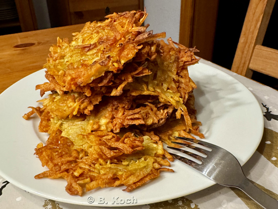 Wie immer sind die Reibekuchen nach diesem Rezept entstanden, allerdings mit dem kleinen Unterschied, dass ich Zwiebelsalz statt -stückchen im Teig hatte und die Reibekuchen morgens vorgebacken wurden und abends nur noch kurz im Backofen aufgewärmt waren. Im Jahr 2024 hatten wir uns nämlich zeitlich mit Teigherstellung und dem anschließendem Ausbacken etwas verkalkuliert.