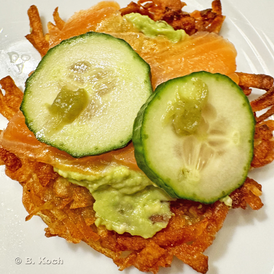 Wie fast jedes Jahr gab es Reibekuchen mit Lachs sowie Lachsforelle, Guacamole, Dips, Gurkenscheiben und – für mich – Chicorée, weil die Bitterstoffe dieses Gemüses bei der Fettverdauung unterstützt.