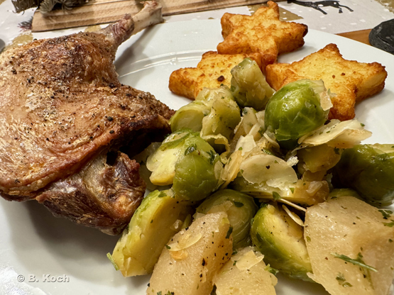 Am ersten Feiertag gab es Gänsekeulen mit Kartoffelsternen (Convenience) und karamellisierten Rosenkohl mit Birnen aus dem Cookit.