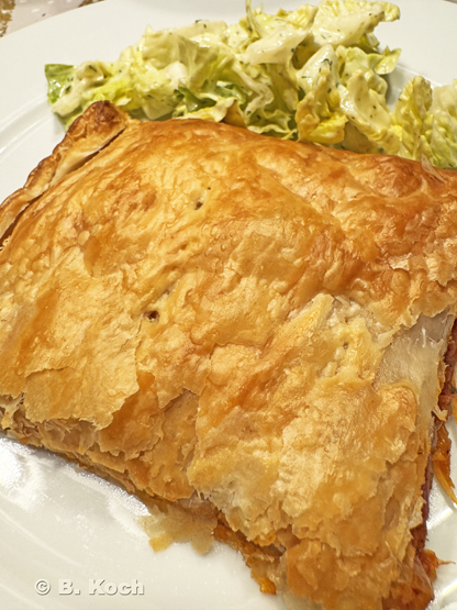 Von Tinas Rezept, in dem auch der Teig selbst gemacht ist, habe ich nur die Füllung übernommen. Aus den bekannten gesundheitlichen Gründen habe ich auf fertigen veganen Bio-Blätterteig zurück gegriffen, auch wenn Yufka- oder Filoteig noch ein bisschen authentischer gewesen wäre.