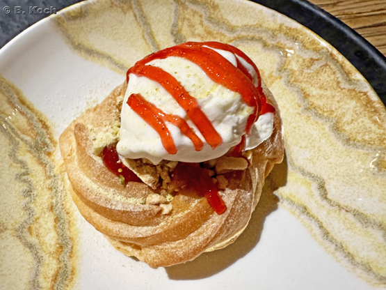 Der Windbeutel war furchtbar trocken, ich habe ihn kaum mit dem Besteck auseinander bekommen. Das Rhabarberkompott – unter der Eiskugel – war gut, hat aber nicht sehr intensiv nach Rhabarber geschmeckt und Tonkabohne und Basilikum habe ich gar nicht wahrgenommen.
