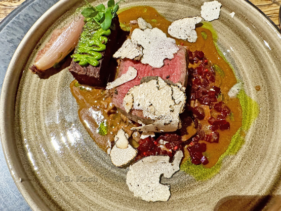 Das Rinderfilet war perfekt gebraten, war mir aber etwas zu viel, so dass ich das Stück Fleisch gegen Martins Trüffel eingetauscht habe.