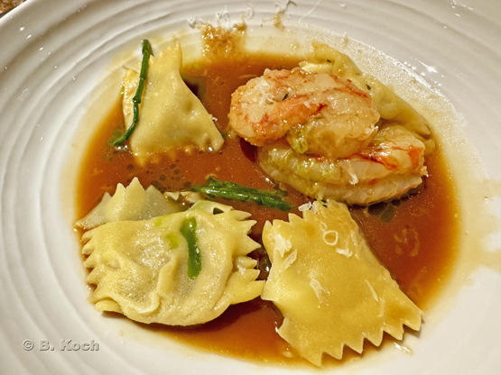 Auberginen Ravioli – Rotschwanz Garnele – Pecorino – Crème Fraîche – Zitronengras Sud