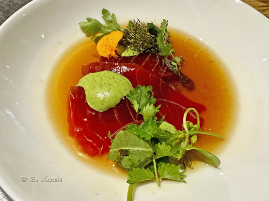 Was soll ich sagen? Der Thunfisch war exzellent, die Dashi köstlich. Der grüne Klecks ist Bärlauchmayonnaise, die sogar mir geschmeckt hat.