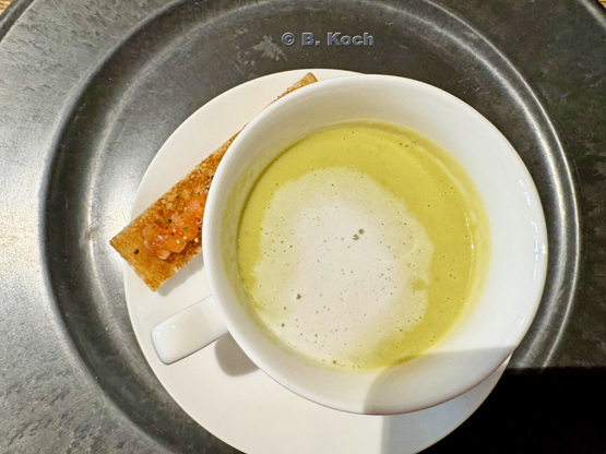 Das Süppchen war schön samtig und hat intensiv nach Erbsen geschmeckt. Das Crostini war leider nicht mehr (?) ganz so kross, aber die Forellencreme passte gut zum Erbsengeschmack.