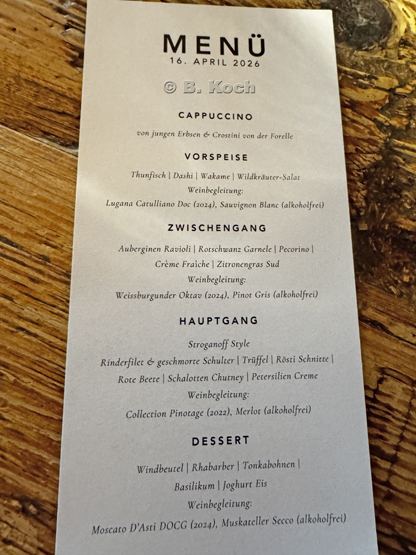 Das Menü las sich schon einmal spannend und richtig lecker – für mich. Für dem GöGa gab es da einige geschmacklichen Herausforderungen wie Wakame, Dashi, Aubergine, Rote Bete, Trüffel und Rhabarber. Er hat aber alles tapfer mitgegessen.