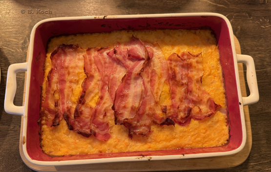 Den Rest vom Stampf haben wir am nächsten mit Baconscheiben belegt als Auflauf serviert.