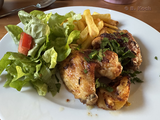 Laut Buch schnecken Zitronenreins und Joghurt gut zu den Flügeln, bei uns gab es jedoch Pommes aus der Heißluftfritteuse und einen Salat mit leichter Vinnaigrette.