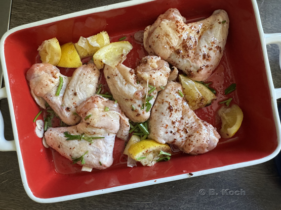 Hähnchenflügel in eine Auflaufform geben, Zitrone darüber auspressen und die ausgepressten Stücke dazu geben. Alle übrigen Zutaten bis auf die gehackte Petersilie zugeben und alles gut durchmischen. Dabei die Hähnchenflügel so wenden, dass beide Seiten Marinade abbekommen und zum Schluss die Hautseite oben liegt.